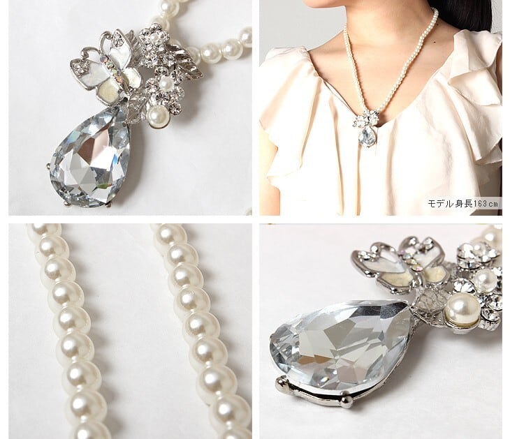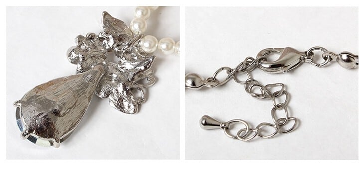 ■サイズ(約): <内周>約52cm+5cmアジャスター、<トップ>縦5.5cmx 横3cm x 厚さ1.3cm、<ネックラインのイミテーションパール直径>約0.6cm